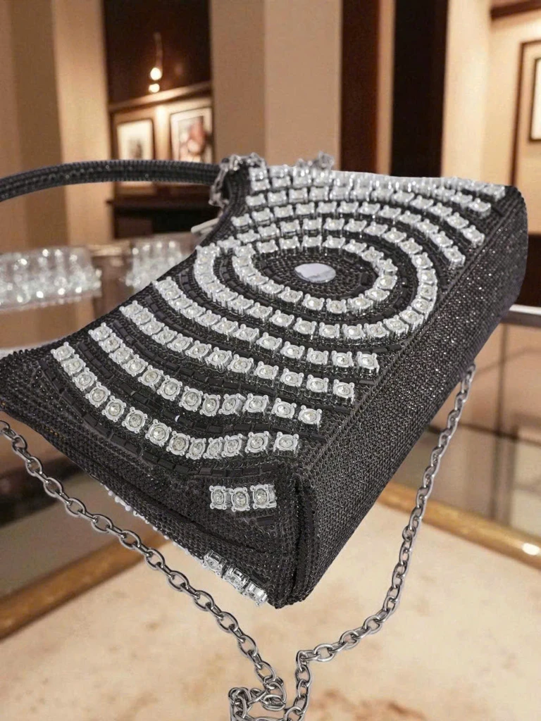 - Eleganten ročni kovček z bleščečimi cirkoni, 1 predal, zapiranje na zadrgo. Elegantni ročaji in okrasna verižica dodajo eleganco. Idealno za posebne priložnosti - blestite s stilom!