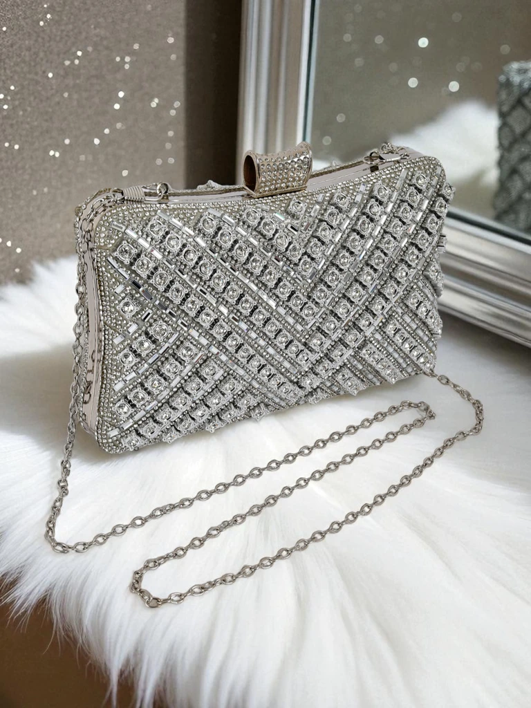 - Večerna torbica z bleščicami, okrašena s sijočimi cirkoni. Nežna verižica doda lahkotnost in eleganco. Idealna za posebne priložnosti – pritegne poglede in dopolni vsak stajling.