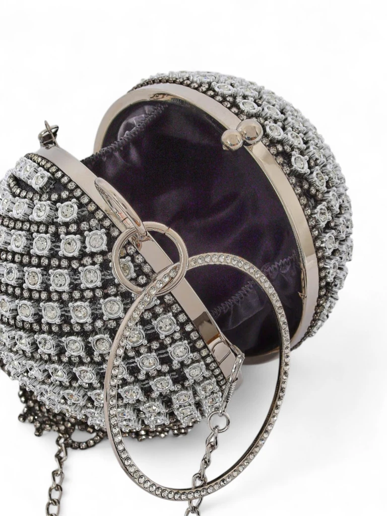 - Okrogla večerna torbica z bleščečimi cirkoni in elegantno verižico za čez ramo. Idealna za večerne izhode – pritegne poglede in dopolni vsak stil.