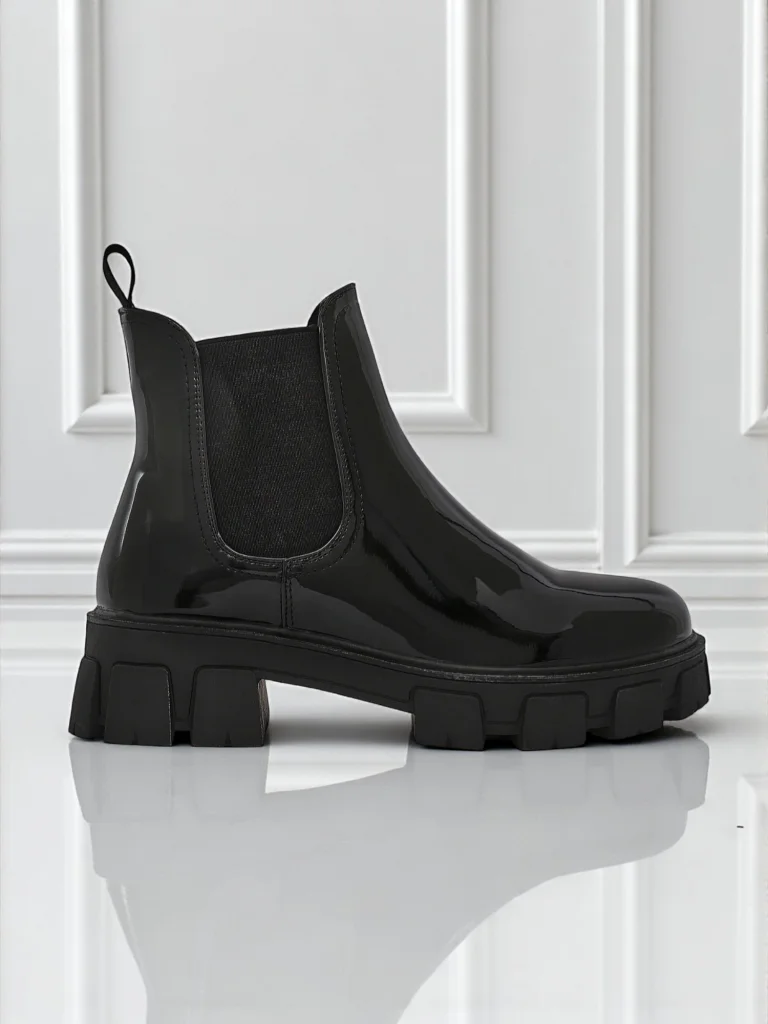 - Izjemne ženski gležnarji z debelejšim podplatom so izdelani iz lakiranega eko usnja. Notranjost iz nežne tkanine zagotavlja udobje tudi v hladnejših dneh. Model je na natik.