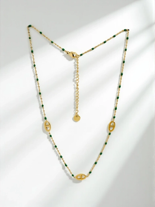 Obesek Aurelia Verde je izjemen primer nakita, ki ga navdihuje grška klasika in italijanski dizajn. Izdelan je iz visokokakovostnega nerjavečega jekla, prevlečenega z zlato plastjo s tehniko PVD, zaradi česar je trpežen in odporen na poškodbe. Pozlata s tehniko PVD zagotavlja učinkovit sijaj in varnost za občutljivo kožo – material ne povzroča alergij in je v skladu z evropskimi standardi. Zeleni koralčki, enakomerno nameščeni po celotni dolžini obeska, mu dajejo edinstven značaj in vnašajo element narave v prefinjeno obliko. Obesek krasijo tri značilne povezave, ki jih navdihuje motiv stare Grčije, ki lepo kontrastirajo z nežnimi zelenimi poudarki. Popoln tako za vsakdanje kot za posebne priložnosti – subtilno poudarja individualni slog in lepoto osebe, ki ga nosi. Prednosti nošenja obeska niso le brezčasna eleganca, temveč tudi udobje uporabe – lahek, do popolnosti dodelan v detajlih, ne bo izgubil sijaja niti pri pogostem nošenju. Zelena barva kamnov spominja na harmonijo in naravo ter vnaša svežino v vsak stil. MIX&MATCH – Ideje za stiliziranje: 1. Casual: Nosite z belo laneno srajco in kavbojkami – obesek bo vašemu videzu dodal razred brez pretiravanja. 2. Poslovno: Kombinirajte z elegantnim suknjičem in gladkim topom, da subtilno poudarite profesionalnost in pozornost do detajlov. 3. Večerno: Popolnoma se ujema s črno obleko ali svilnatim kombinezonom – poudarite učinek elegance z nežnimi zlatimi uhani v istem slogu. Nega in shranjevanje: Da ohranite sijaj obeska, ga shranjujte v ločeni škatli, izogibajte se stiku z vodo, parfumi in detergenti. Očistite z mehko krpo, namenjeno nakitu. Obesek ima standardno garancijsko zaščito proizvajalca. Modni nakit v letu 2024 se nagiba k vrnitvi h klasičnim motivom in naravi – obeski z barvnimi poudarki, kot je Aurelia Verde, veljajo za 'must have' te sezone. To ni le učinkovit okras, temveč tudi način za izražanje lastne izvirnosti v duhu brezčasnega sloga.
