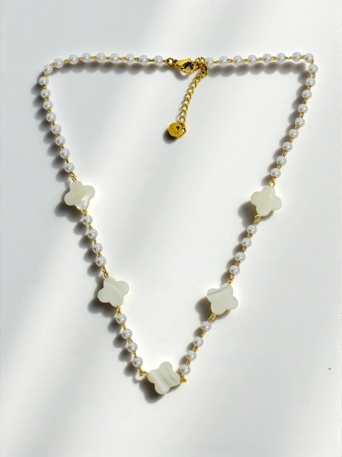 - Ogrlica s sintetičnimi biseri in zlatimi elementi – eleganten, brezčasen dodatek.