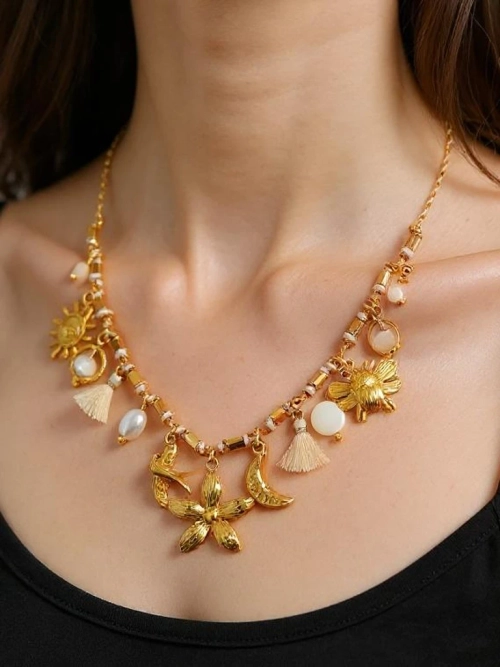 - Ogrlica Aurora Floralis s čari in biseri je edinstven nakit v boho stilu, idealen za vsako priložnost.