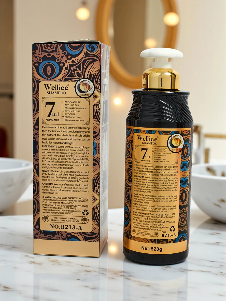 • Wellice Šampon 7 v 1 za poškodovane in suhe lase z aminokislinami intenzivno obnavlja, vlaži in krepi lase. Zmanjšuje lomljivost, daje sijaj, gladi in olajša razčesavanje, lase pa pušča mehke in zdrave.
