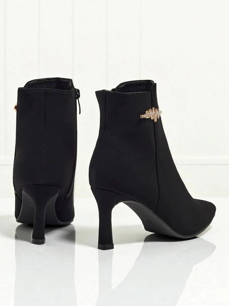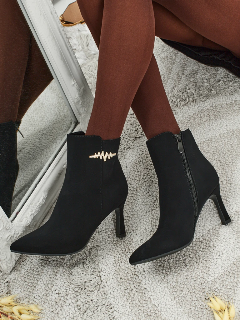 - Eleganten ženski gležnarji iz mat eko usnja so idealna rešitev za hladnejše dni. Model se zapenja z zadrgo in ima podlogo v obliki krzna. Model ima visoko peto in koničasto obliko. Okrašen z elementom iz cirkonov.