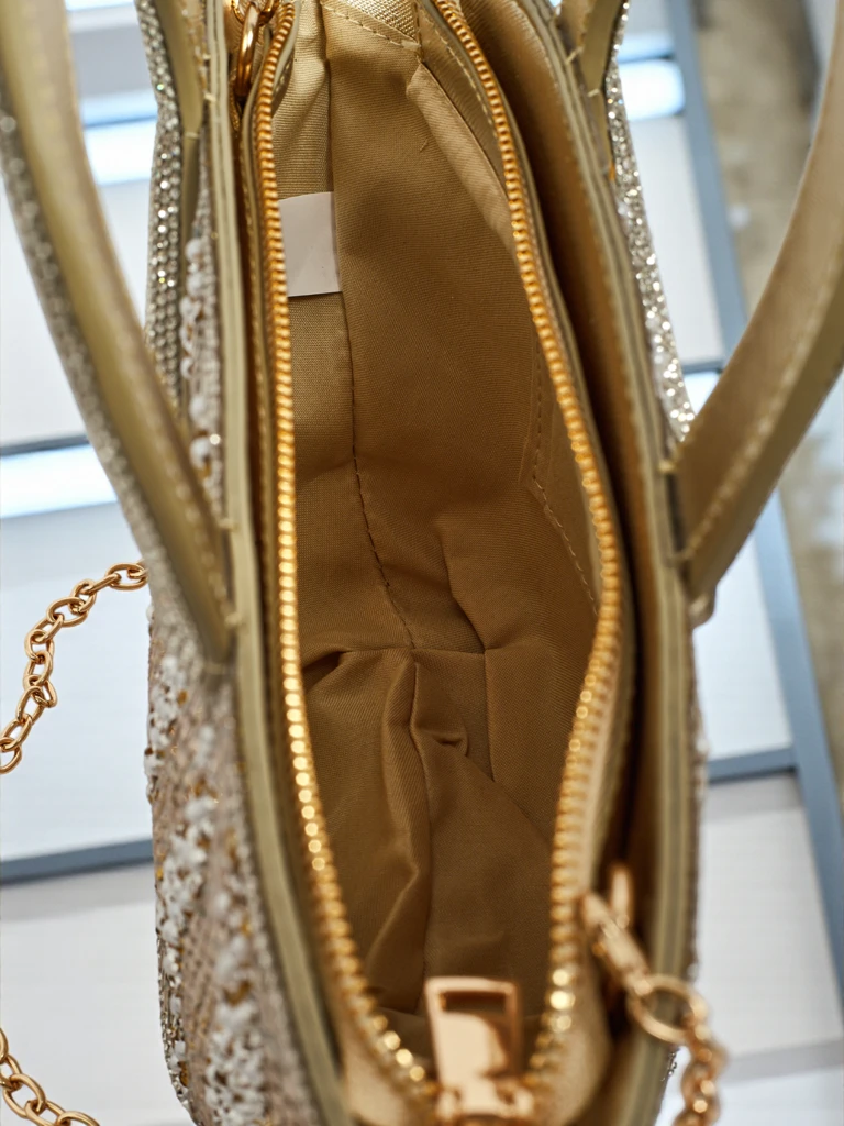 - Osupljiva majhna ženska torbica s cirkoni. Zapira se z zadrgo, ima ročaje in snemljivo verižico. Idealna za večerne izhode - majhna, fenomenalna in polna sijaja!