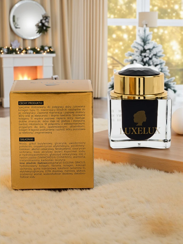 - Luksuzni anti-age krem Luxelux s kolagenom tipa III intenzivno obnavlja in učvršćuje kožu. Zahvaljujući kombinaciji inovativnih tehnologija i azijskih sastojaka, osigurava glatkoću, elastičnost i mlađi izgled. Idealan za dan i noć.