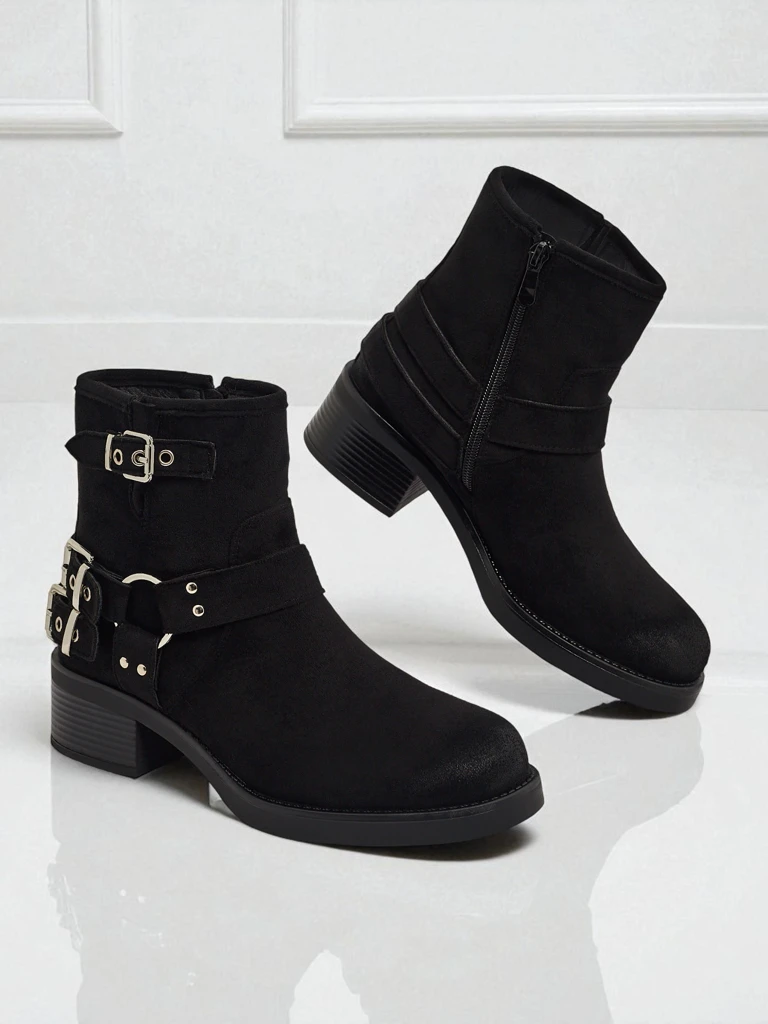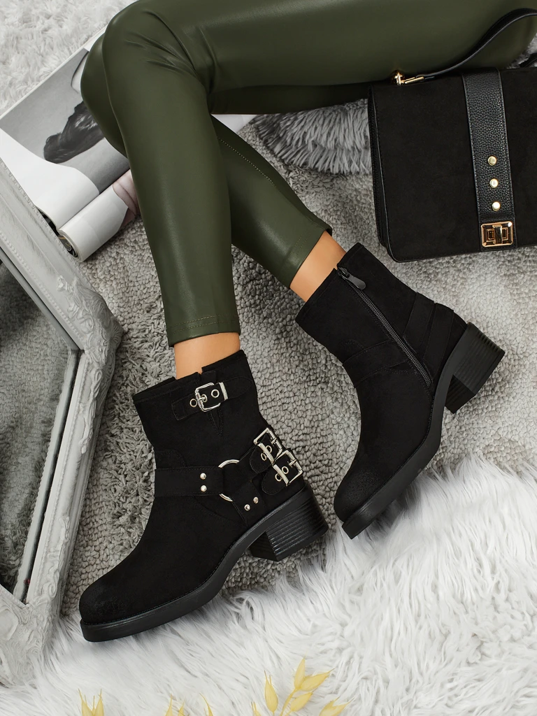 • Botas tobilleras de mujer de ante ecológico con hebillas. Forradas con un delicado pelaje, los zapatos se abrochan con una cremallera. Decoradas con hebillas. ¡Adecuadas para muchas combinaciones de estilo femenino!