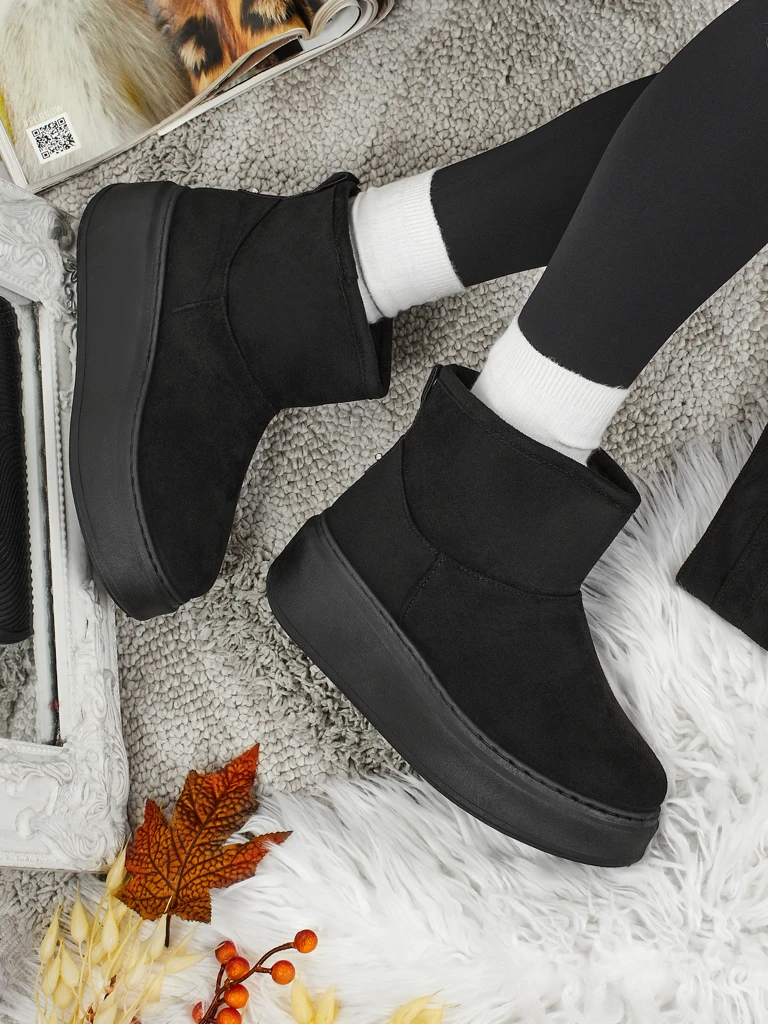 - Odlični ženski zimski škornji za sneg na debelejšem podplatu tipa platforma. Zgornji del je izdelan iz ekološkega semiš usnja, notranjost je izolirana s krznom. Imajo dodatno zapenjanje zgornjega dela. Idealna osnova za zimo!