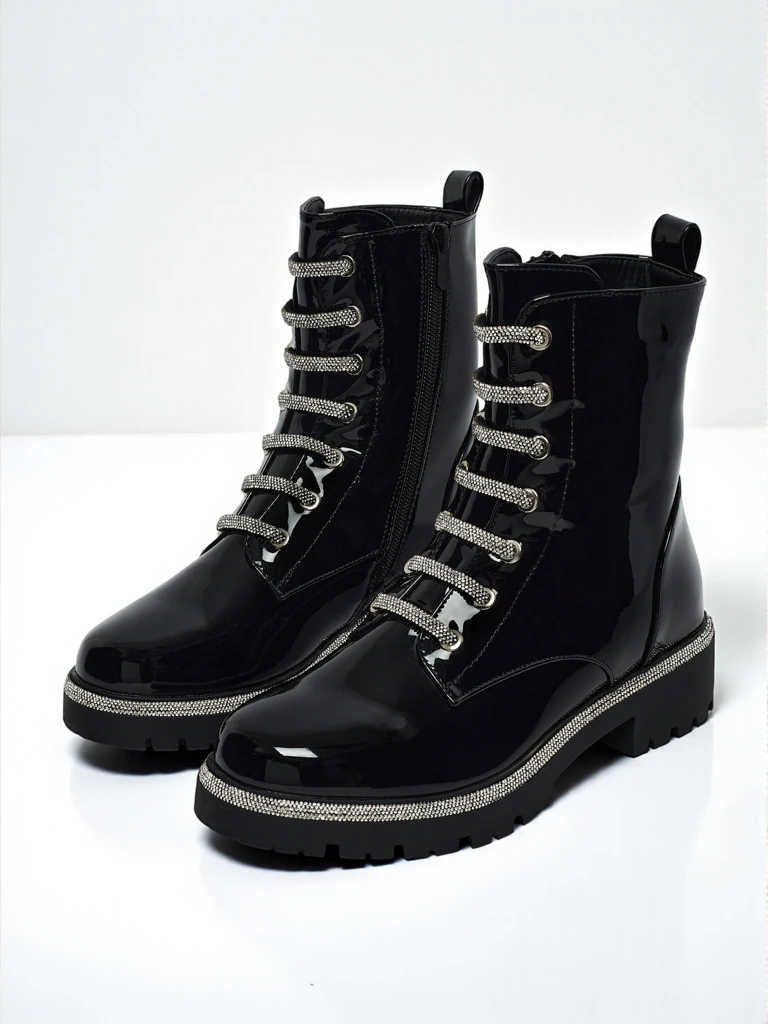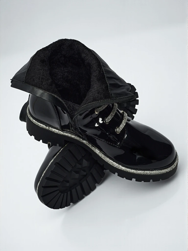 - Ženski gležnarji iz lakiranega eko usnja, z zadrgo in okrasno vezalko ter okroglo konico, dodatno podloženi s krznom – modernost, udobje in stil v enem.