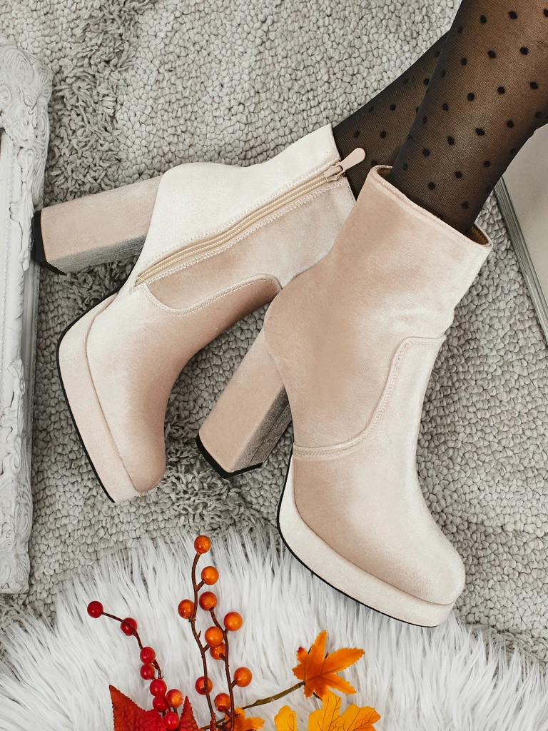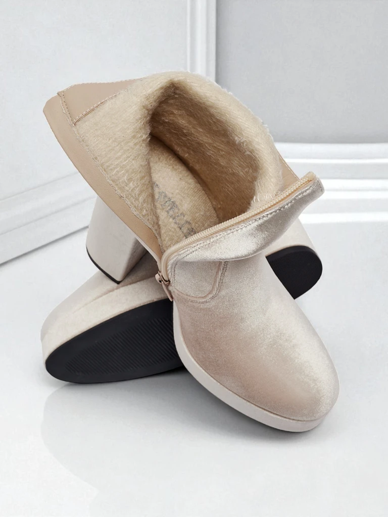 - Udobni gležnarji s peto, izdelani iz velurju podobne tkanine. Model se zapenja z zadrgo. Ima nežno podlogo v obliki krzna. Idealna izbira za jesen!