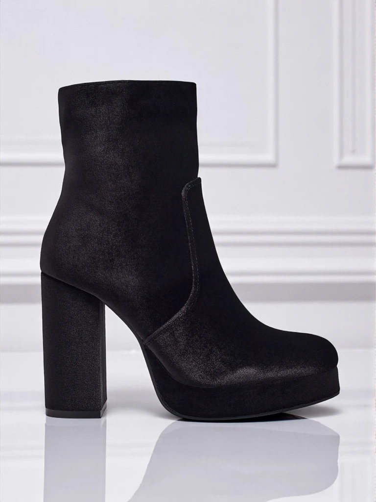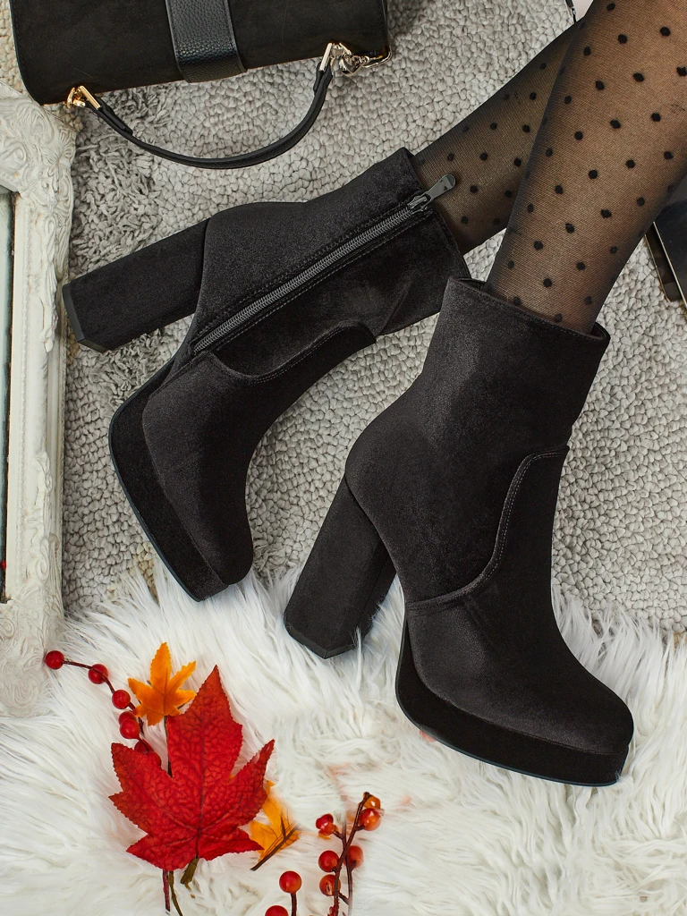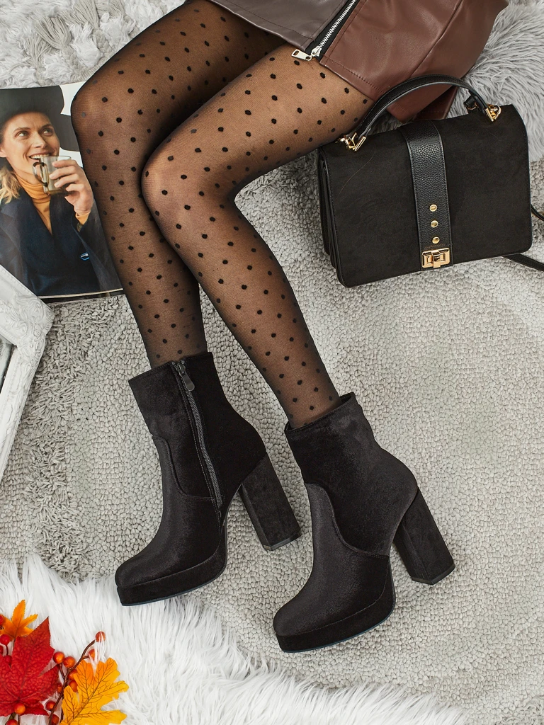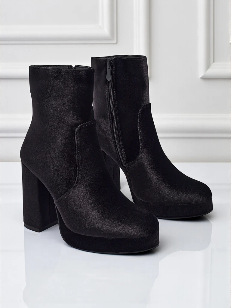 • Udobni gležnarji s peto, izdelani iz velurju podobne tkanine. Model se zapenja z zadrgo. Ima nežno podlogo v obliki krzna. Idealna izbira za jesen!