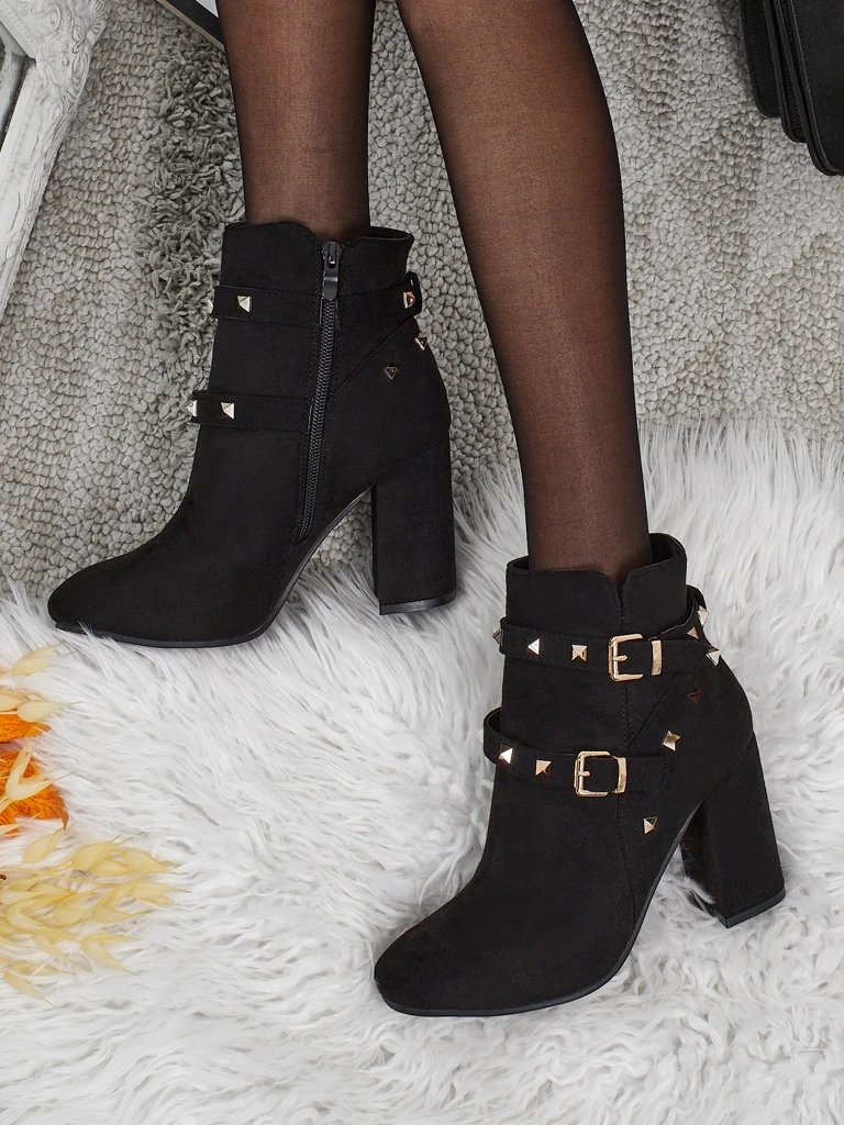 Charakterystycznym elementem są złote detale w postaci klamerek i ćwieków, które dodają botkom nieco punkowego charakteru. Słupkowy obcas o wysokości 9 cm zapewnia stabilność i wygodę podczas noszenia, a zamek błyskawiczny z tyłu ułatwia zakładanie i ściąganie.