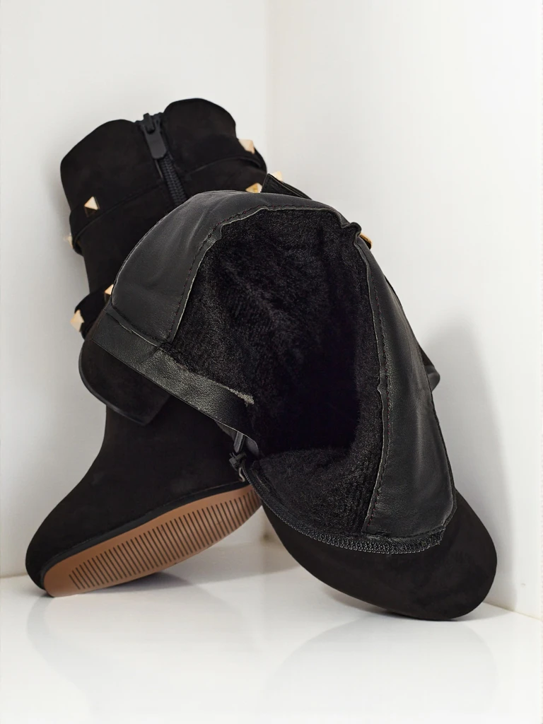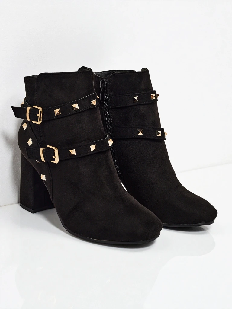 - Wygodne botki na słupku, wykonane z eko skóry zamszowej. Model zapinany na zamek. Model posiada delikatne ocieplenie w formie futerka oraz ozdobne paseczki z dżetami na cholewce. Idealny wybór na jesień!